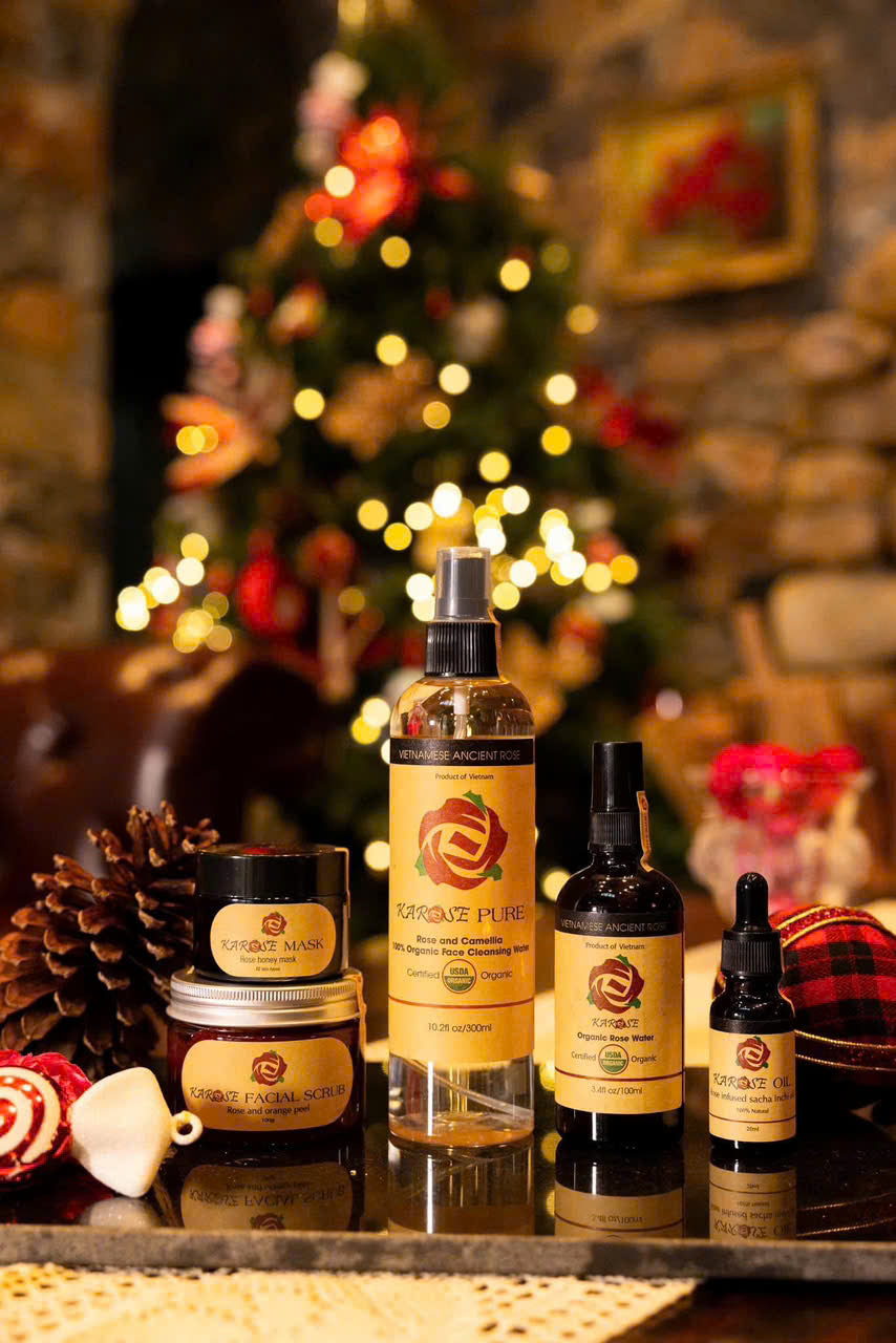 ORGANICS USDA Certificated Facial Care Set 100% Organic From Vietnam Unique Ancient Roses - Rose Water Facial Cleanser, Rose Facial Scrub, Rose Honey Facial Mask, Rose Water Toner, Rose Oil
